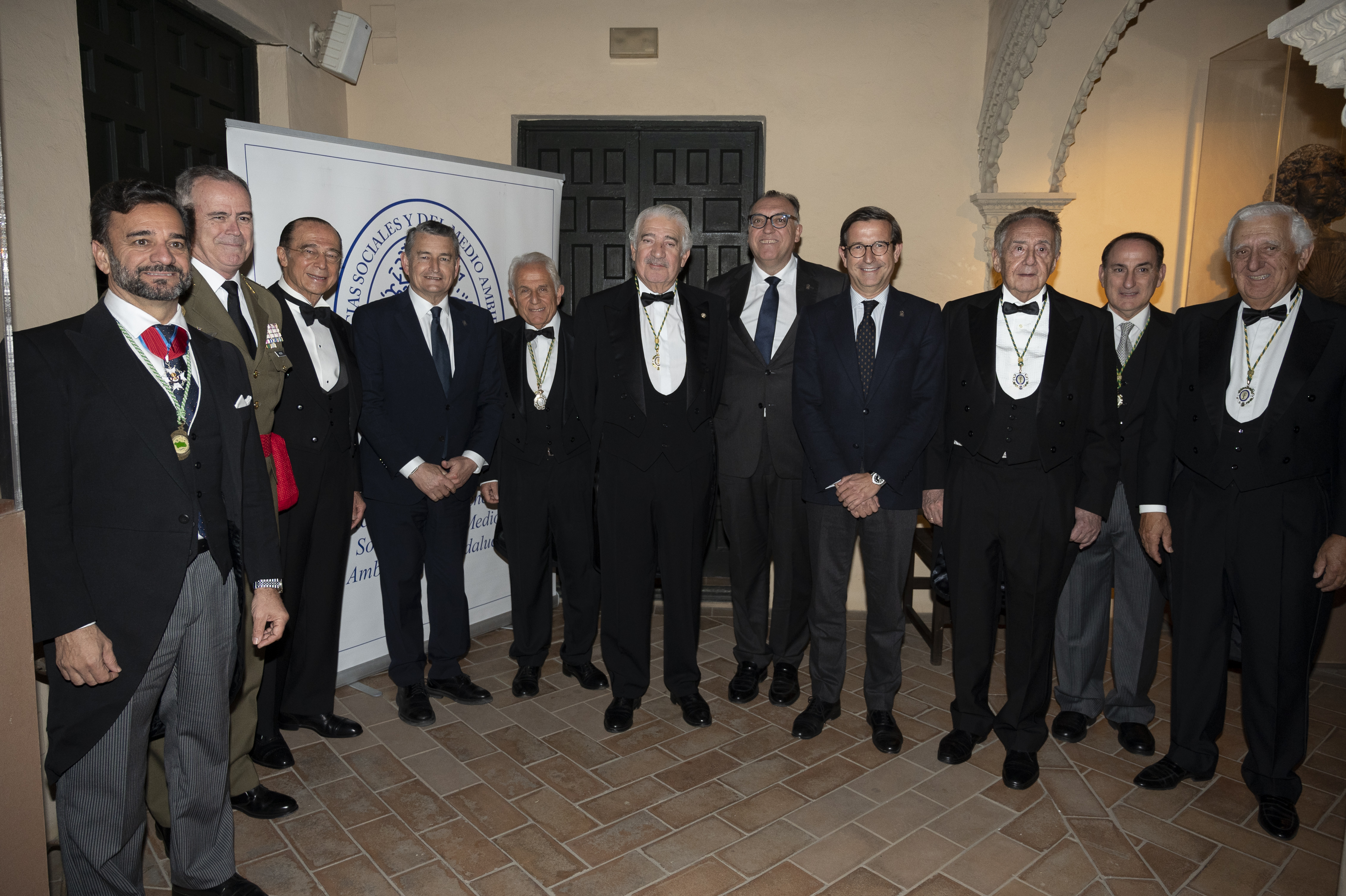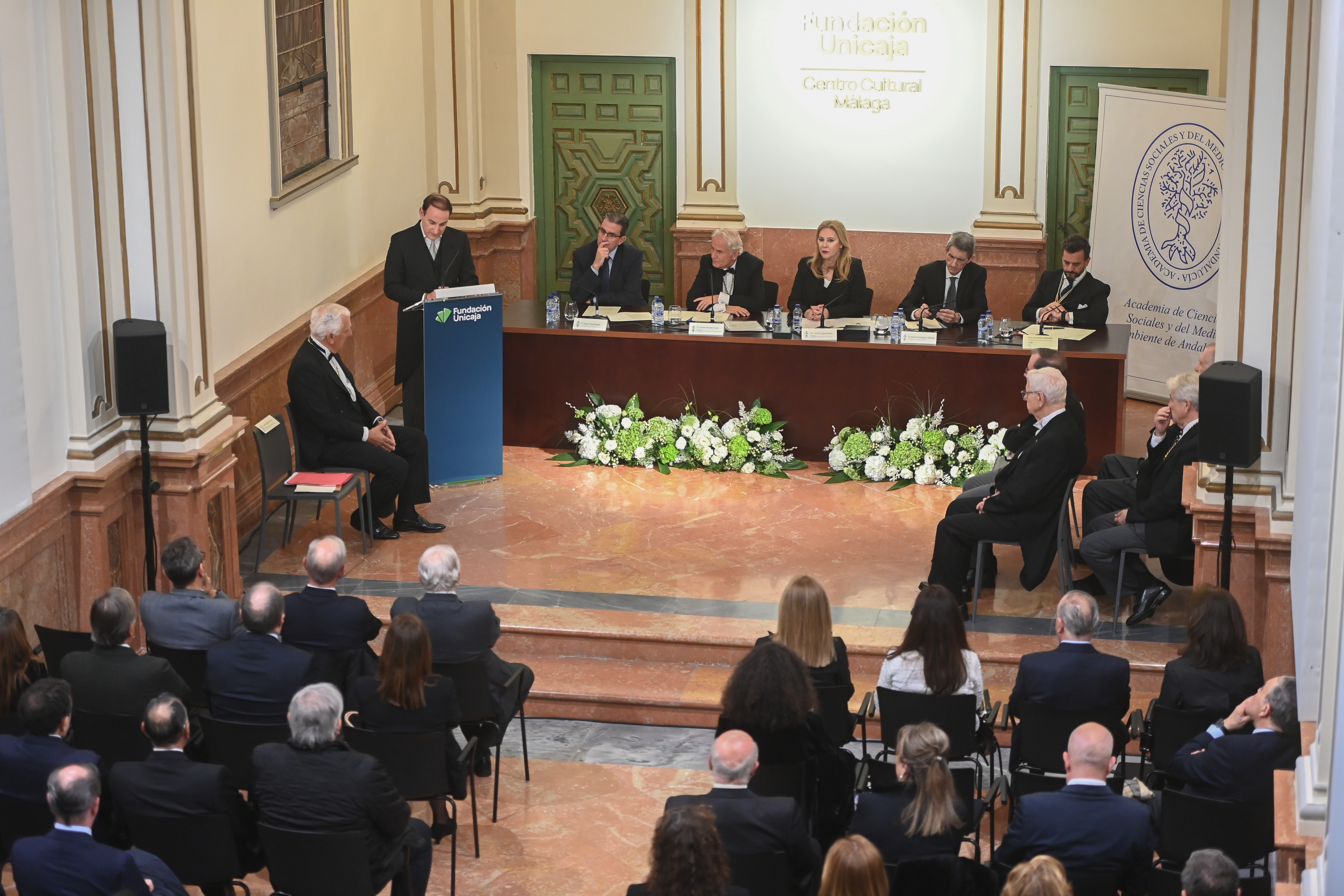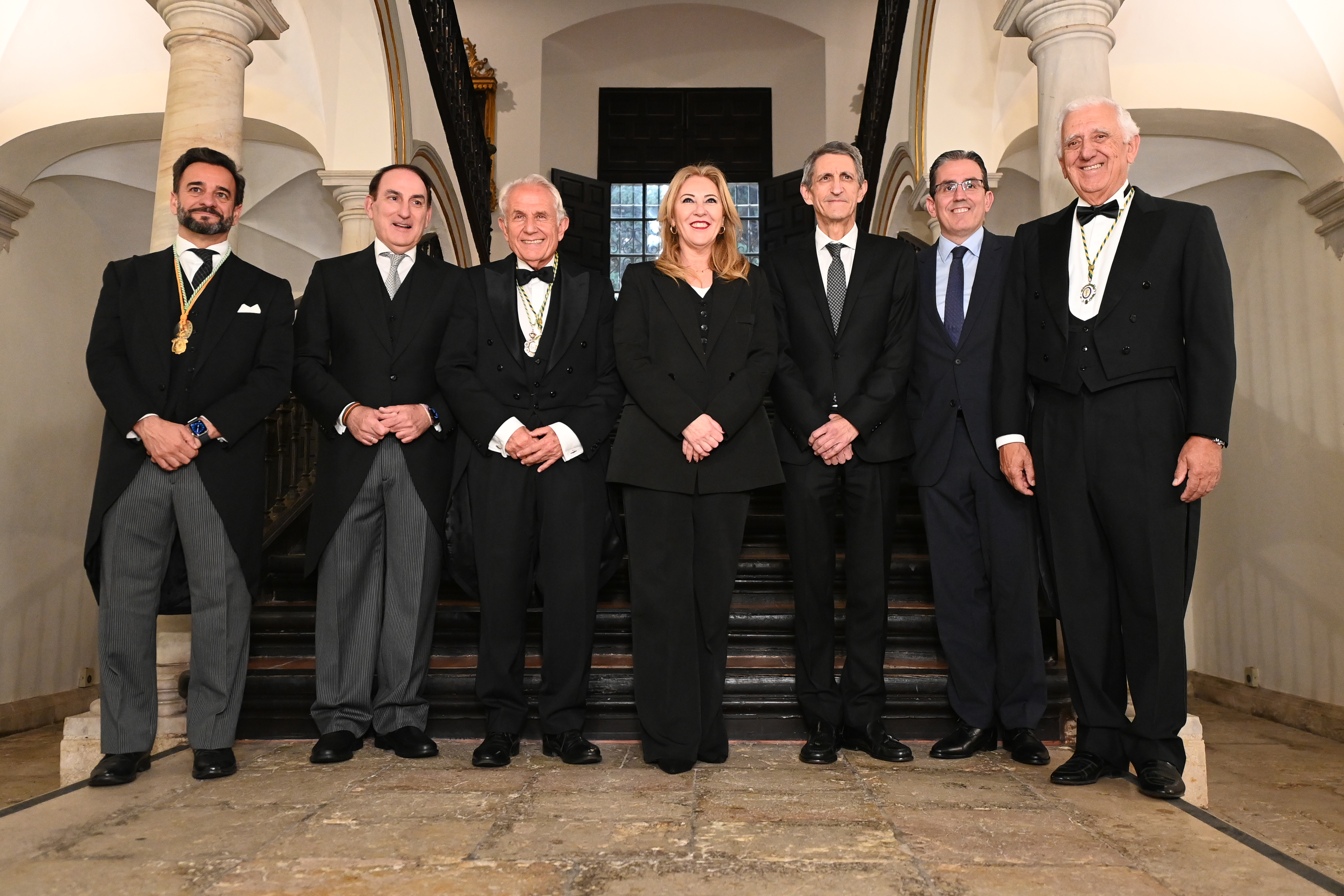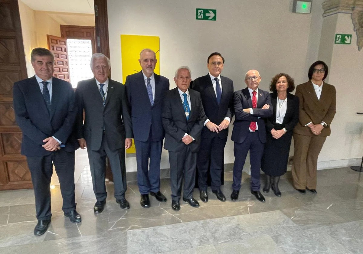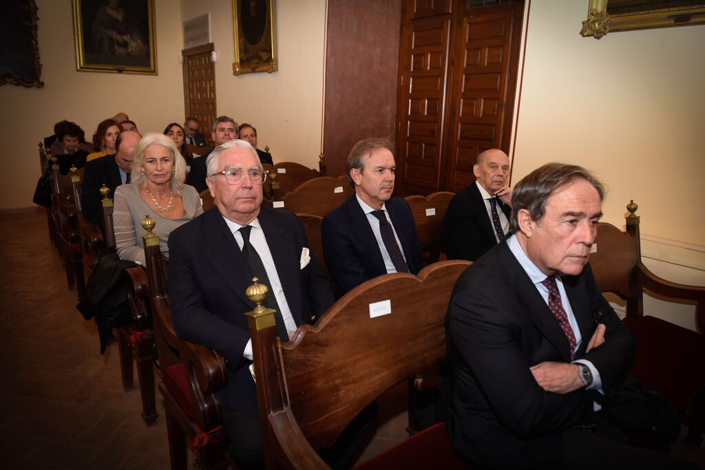 Recepción de autoridades Manuel Alejandro Cardenete Flores, Presidente de la Cámara de Cuentas de Andalucía, Javier González de Lara y Sarria, Antonio Pascual Acosta, Presidente de la Academia, Carolina España Rey, Consejera de Economía, Hacienda y Fondos Europeos de la Junta de Andalucía, José Manuel Domínguez Martínez, Presidente de la Fundación Bancaria Unicaja, Sergio Corral Delgado, Director General de la Fundación Bancaria Unicaja, y Santiago Herrero León, Secretario canciller de la Academia.
