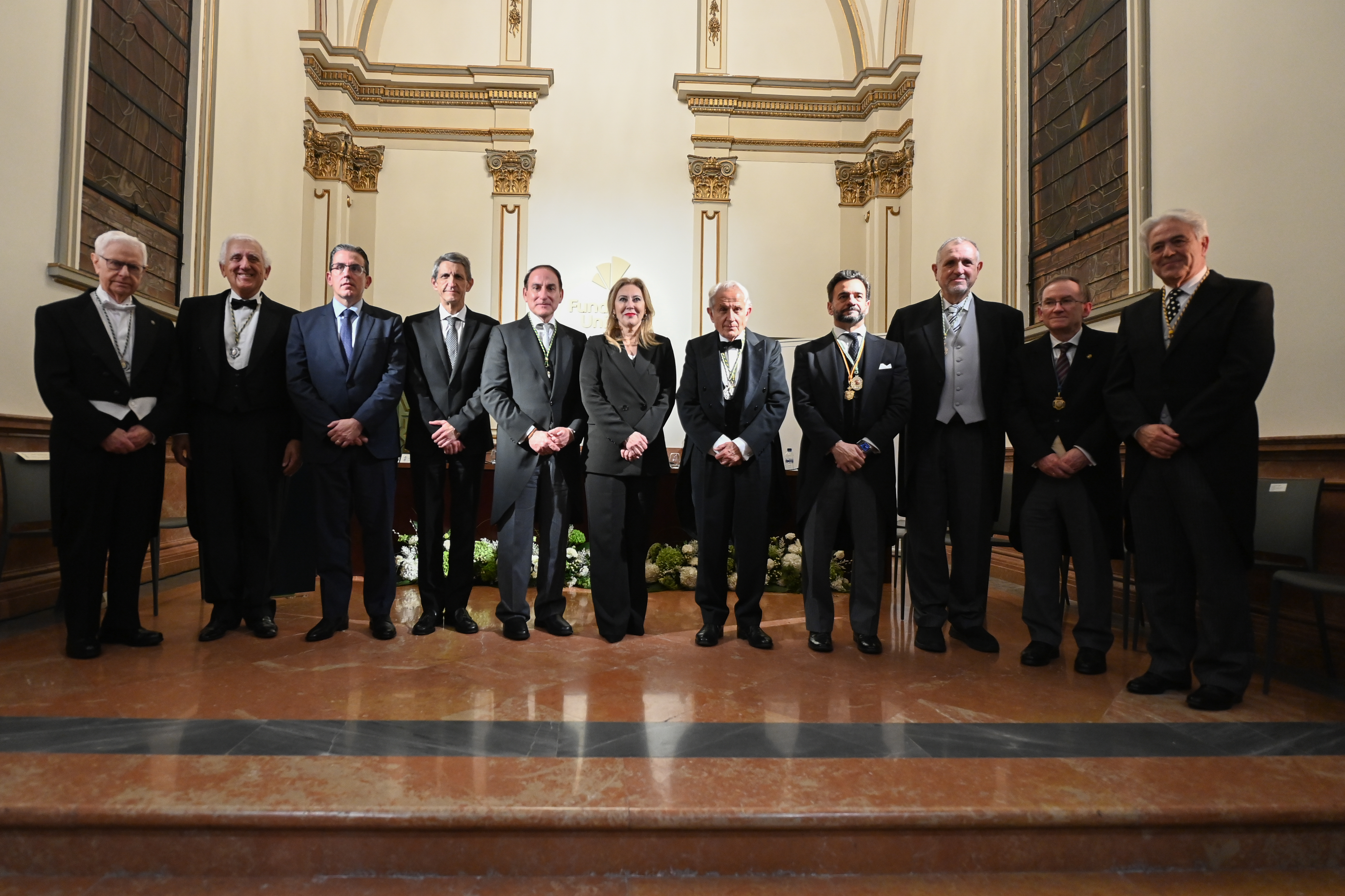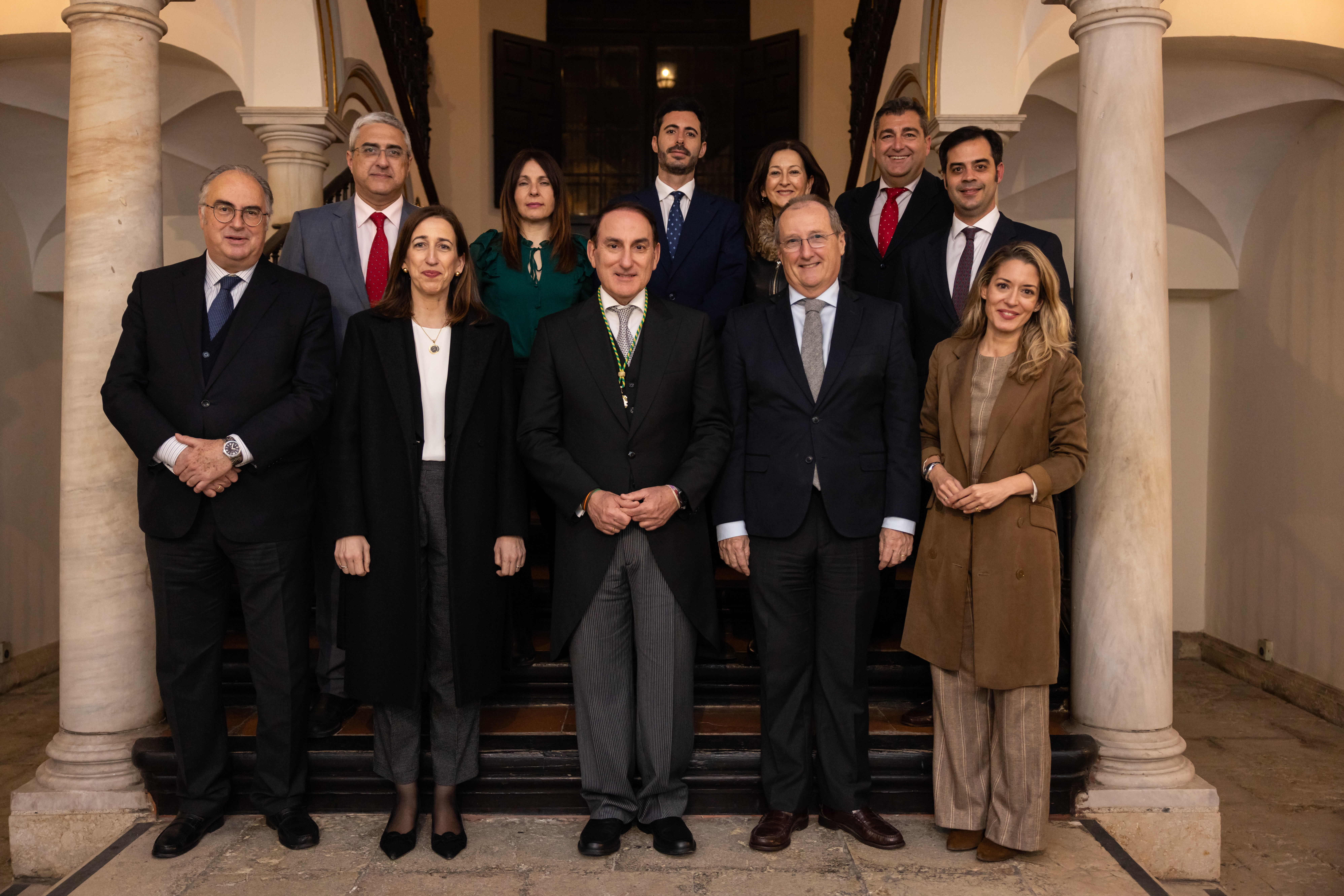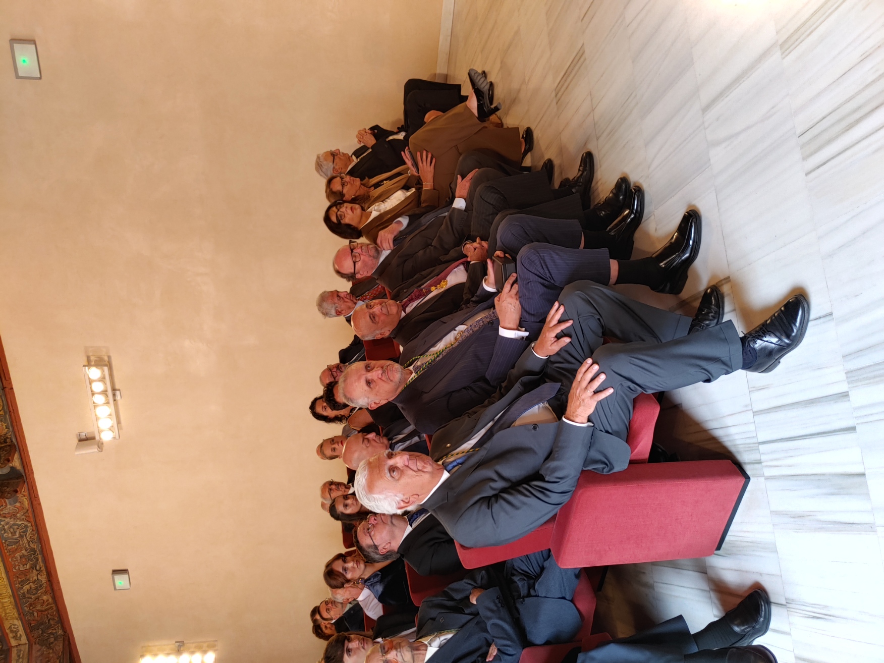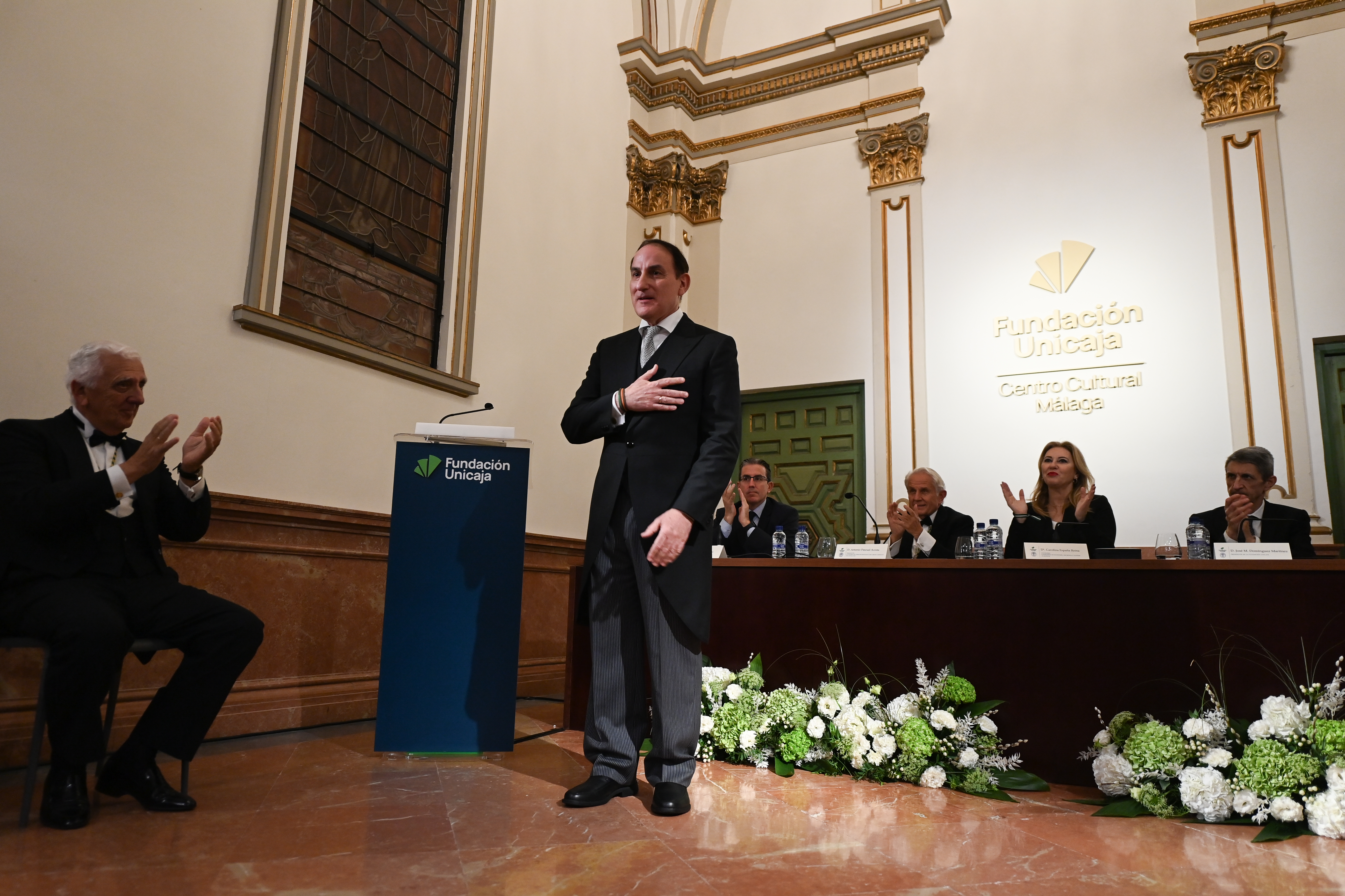 Recepción de autoridades Manuel Alejandro Cardenete Flores, Presidente de la Cámara de Cuentas de Andalucía, Javier González de Lara y Sarria, Antonio Pascual Acosta, Presidente de la Academia, Carolina España Rey, Consejera de Economía, Hacienda y Fondos Europeos de la Junta de Andalucía, José Manuel Domínguez Martínez, Presidente de la Fundación Bancaria Unicaja, Sergio Corral Delgado, Director General de la Fundación Bancaria Unicaja, y Santiago Herrero León, Secretario canciller de la Academia.