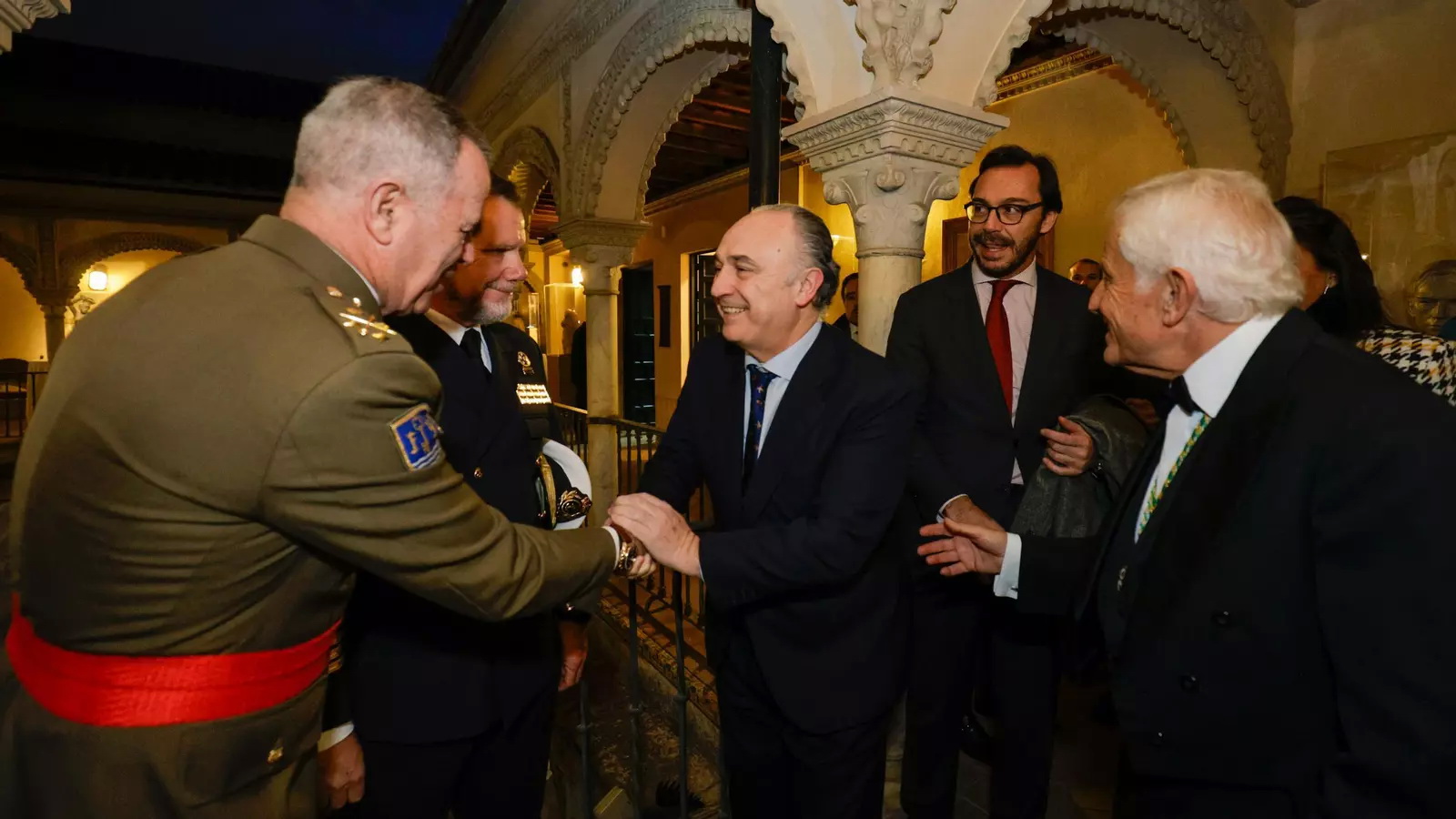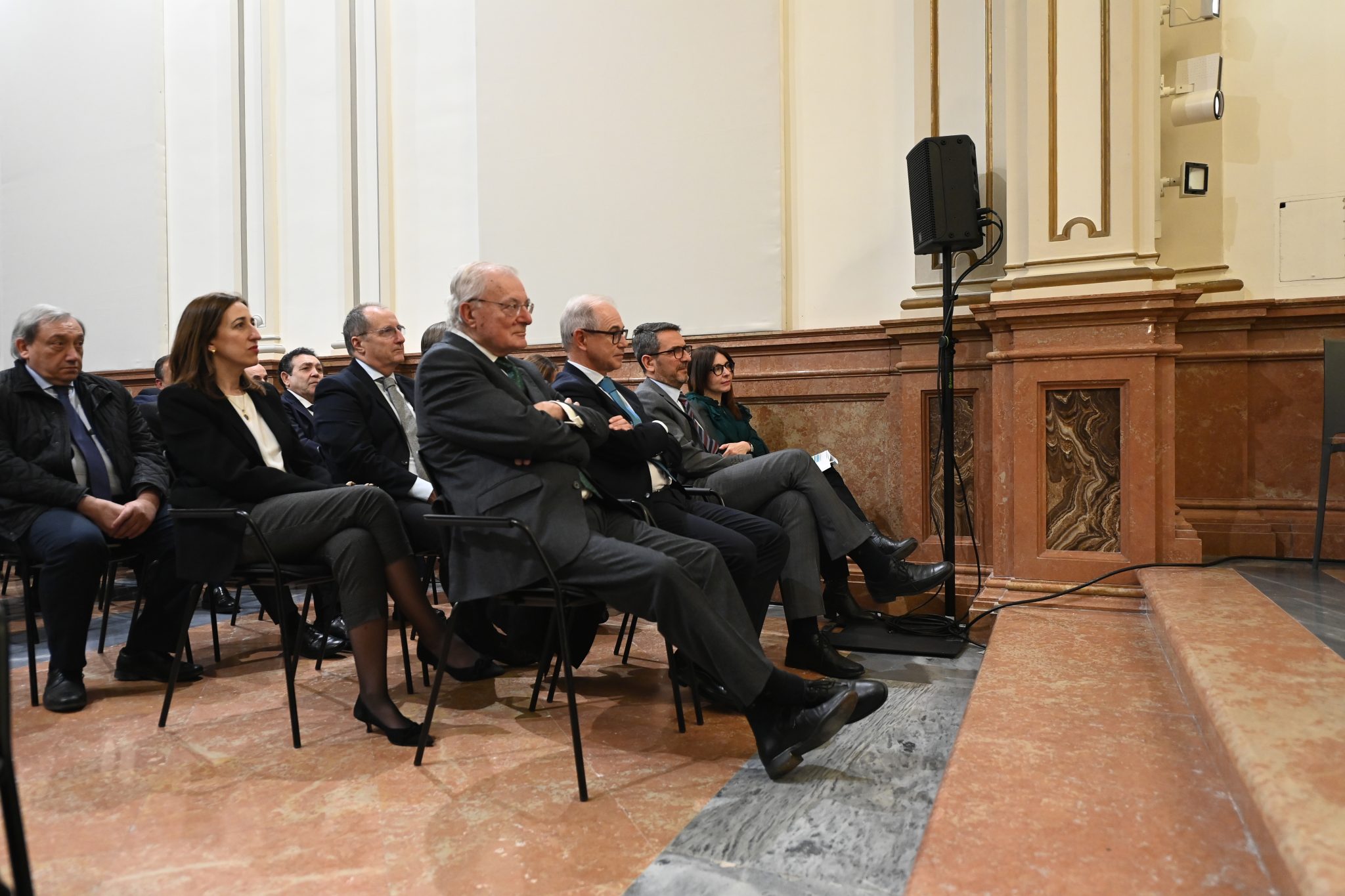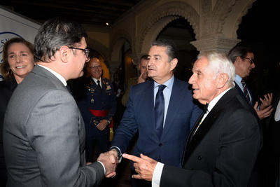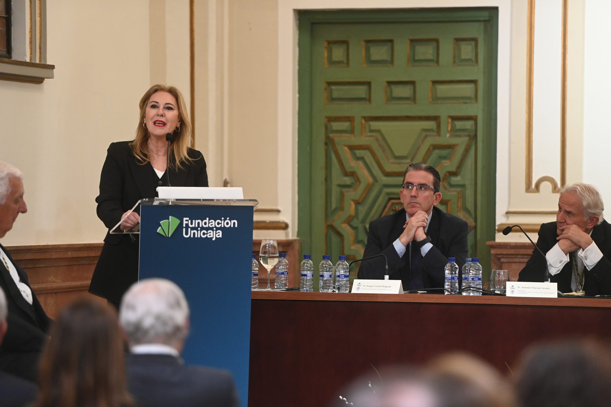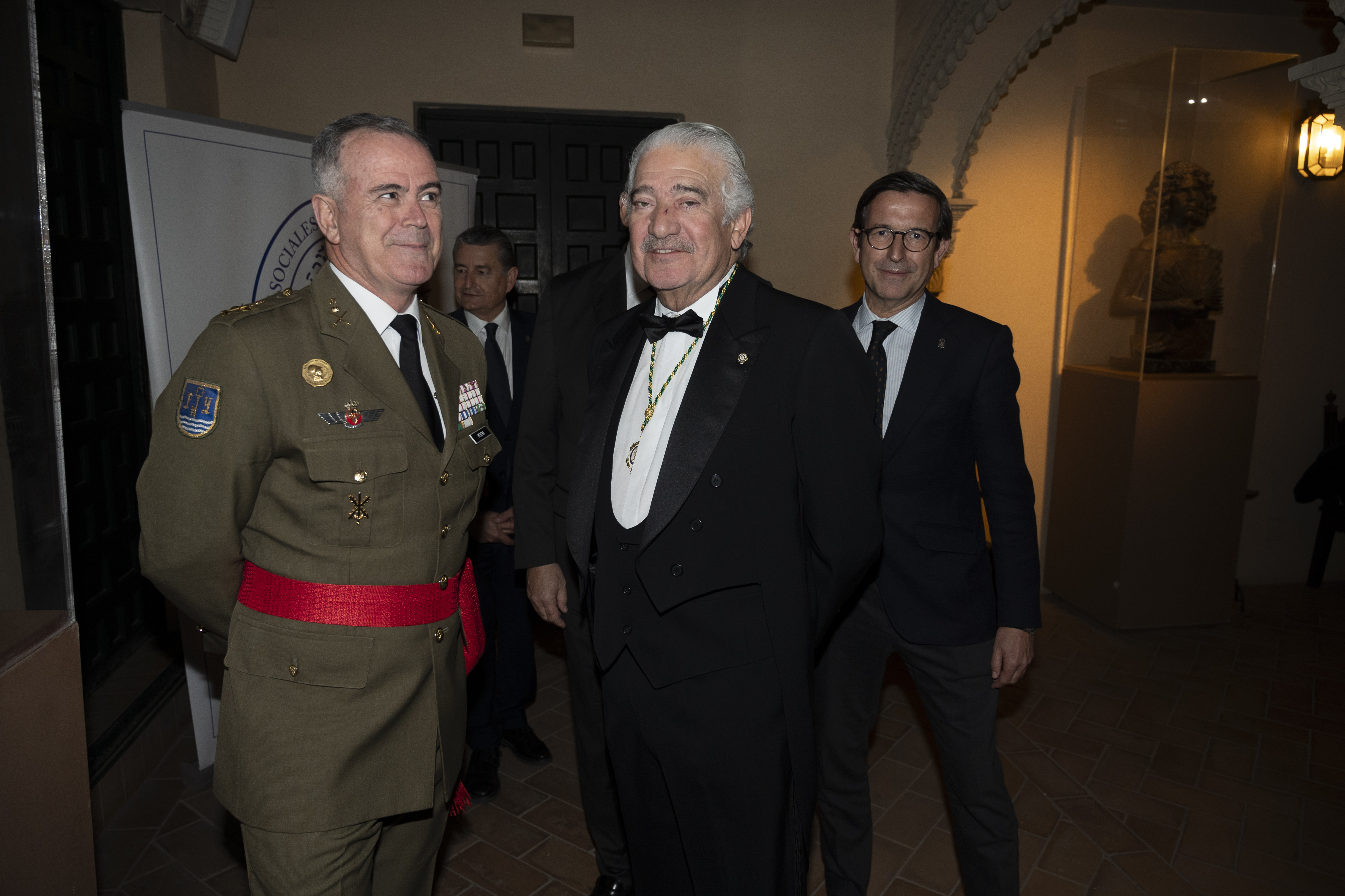 Recepción de autoridades Manuel Alejandro Cardenete Flores, Presidente de la Cámara de Cuentas de Andalucía, Javier González de Lara y Sarria, Antonio Pascual Acosta, Presidente de la Academia, Carolina España Rey, Consejera de Economía, Hacienda y Fondos Europeos de la Junta de Andalucía, José Manuel Domínguez Martínez, Presidente de la Fundación Bancaria Unicaja, Sergio Corral Delgado, Director General de la Fundación Bancaria Unicaja, y Santiago Herrero León, Secretario canciller de la Academia.