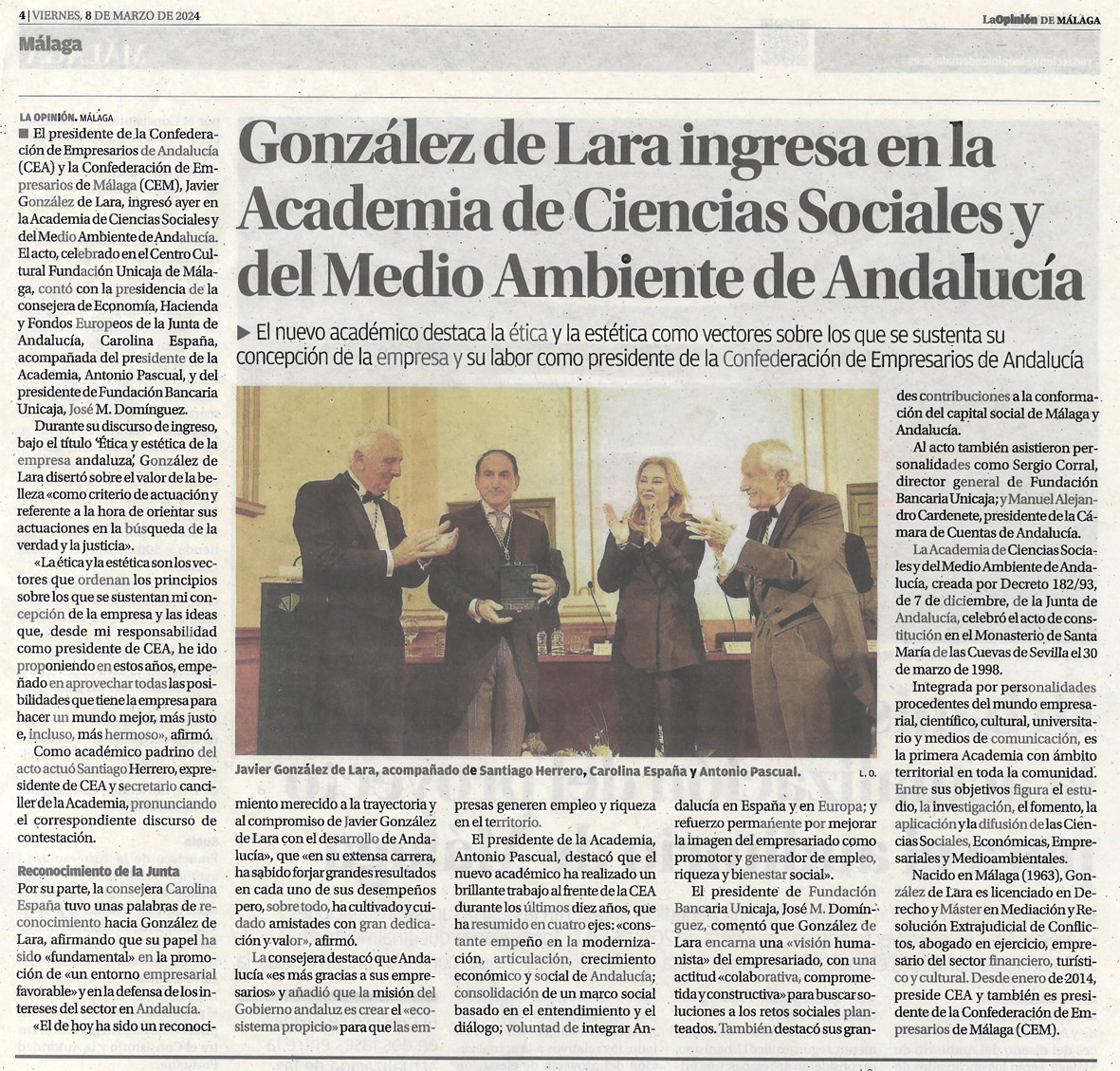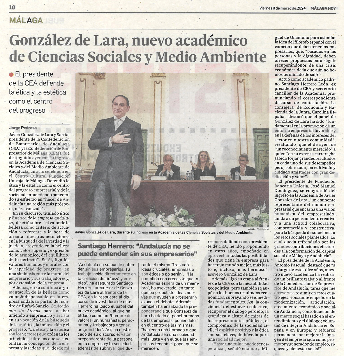 El jueves 7 de marzo, a las 18:00h, en el Centro Cultural de la Fundación Unicaja, Plaza del Obispo, Málaga, tendrá lugar el Acto de Ingreso, como Académico Numerario, del Ilmo. Sr. D. Javier González de Lara y Sarria con el discurso Ética y estética en la empresa andaluza a quien contestará el Ilmo. Sr. D. Santiago Herrero León, Académico Secretario Canciller.
