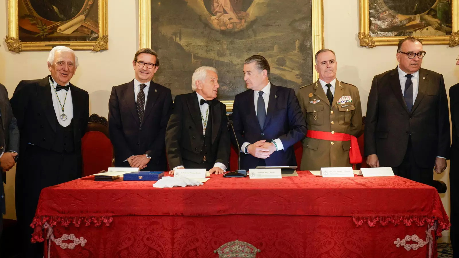 Antonio Pascual Acosta impone la medalla de académico a Antonio Vázquez Romero en presencia de Antonio Sanz Cabello. Antonio Pascual Acosta, Antonio Vázquez Romero y Antonio Sanz Cabello. Antonio Vázquez Romero saluda a las personas del estrado. Los académicos José Joly Martínez de Salazar, José Luis Sánchez Domínguez, María Concepción Yoldi García, y Antonio Vázquez Romero. En segunda fila Andrés González Carmona y Javier González de Lara y Sarria.