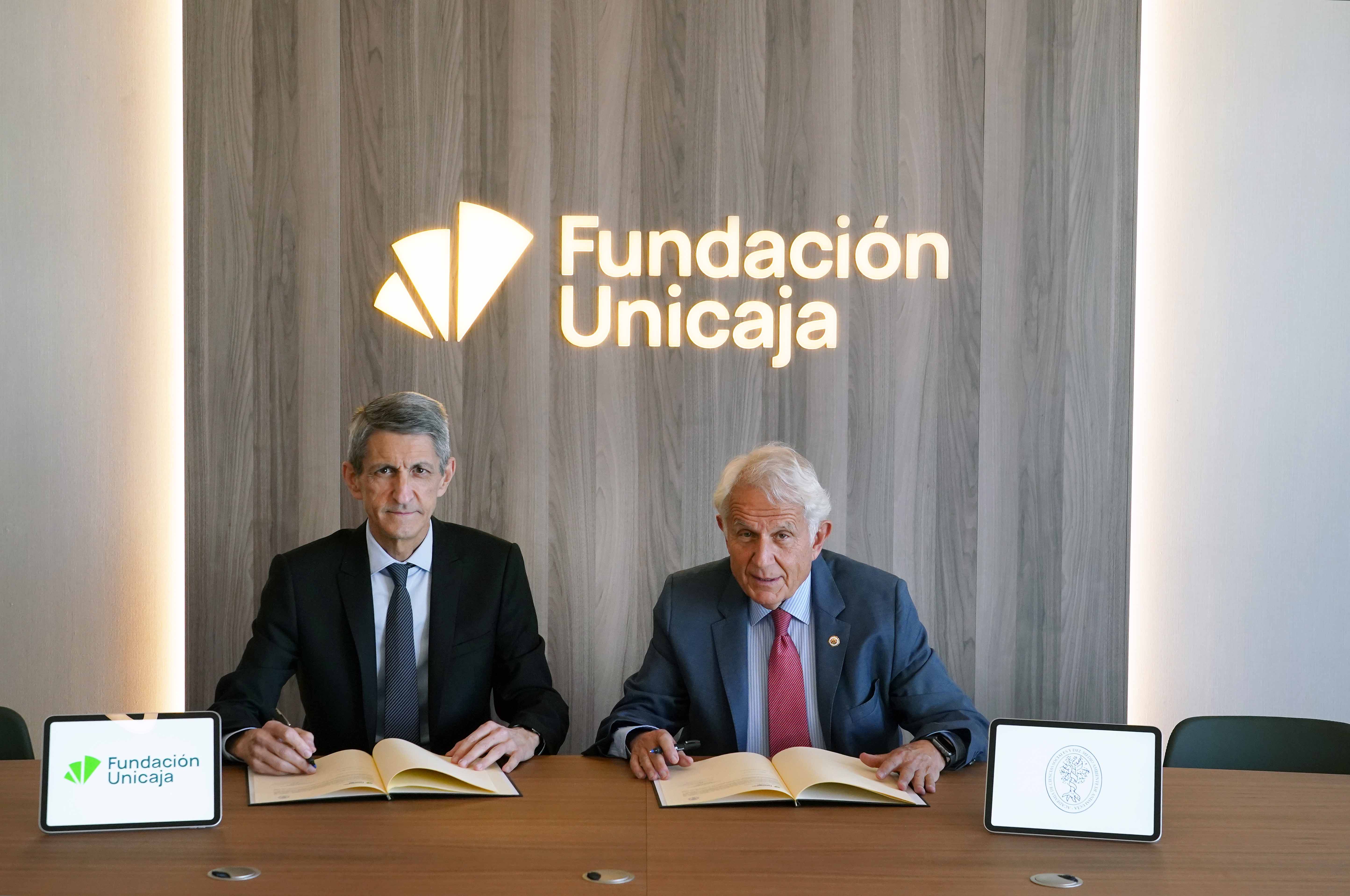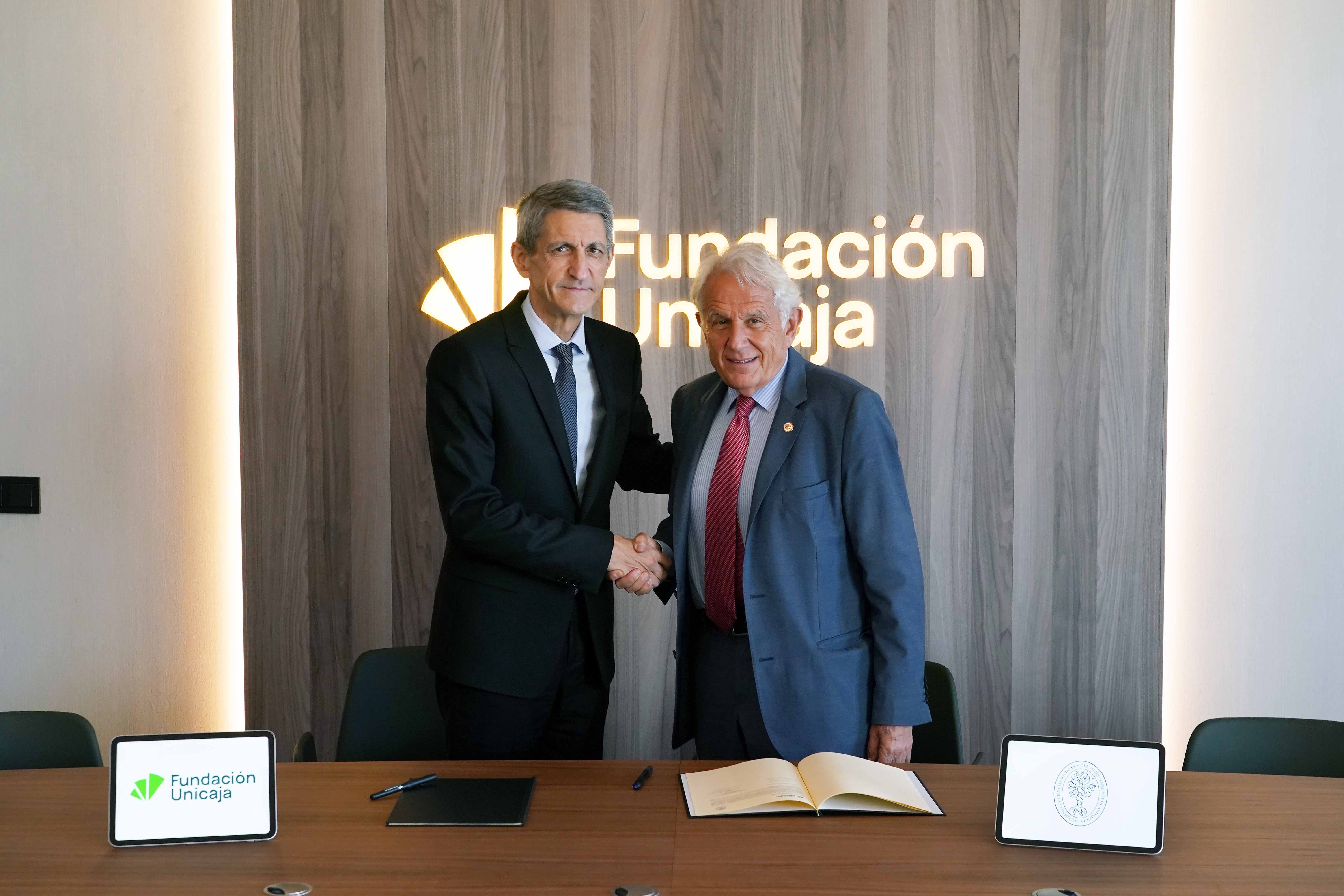 La Fundación Unicaja, representada por su presidente, José M. Domínguez, y la Academia de las Ciencias Sociales y del Medio Ambiente de Andalucía, representada por su presidente, Antonio Pascual, han firmado el convenio que refleja el compromiso con la celebración de los XV Premios de Trayectorias Académicas Universitarias, que distinguen al alumnado, tanto de Grado como de Máster, que haya finalizado sus estudios en el curso 2023/24 en universidades de Andalucía con los mejores expedientes y curriculum vitae en los diferentes ámbitos del conocimiento que corresponden a la Academia, lo que responde al interés de ambas instituciones en distinguir y premiar la excelencia académica.