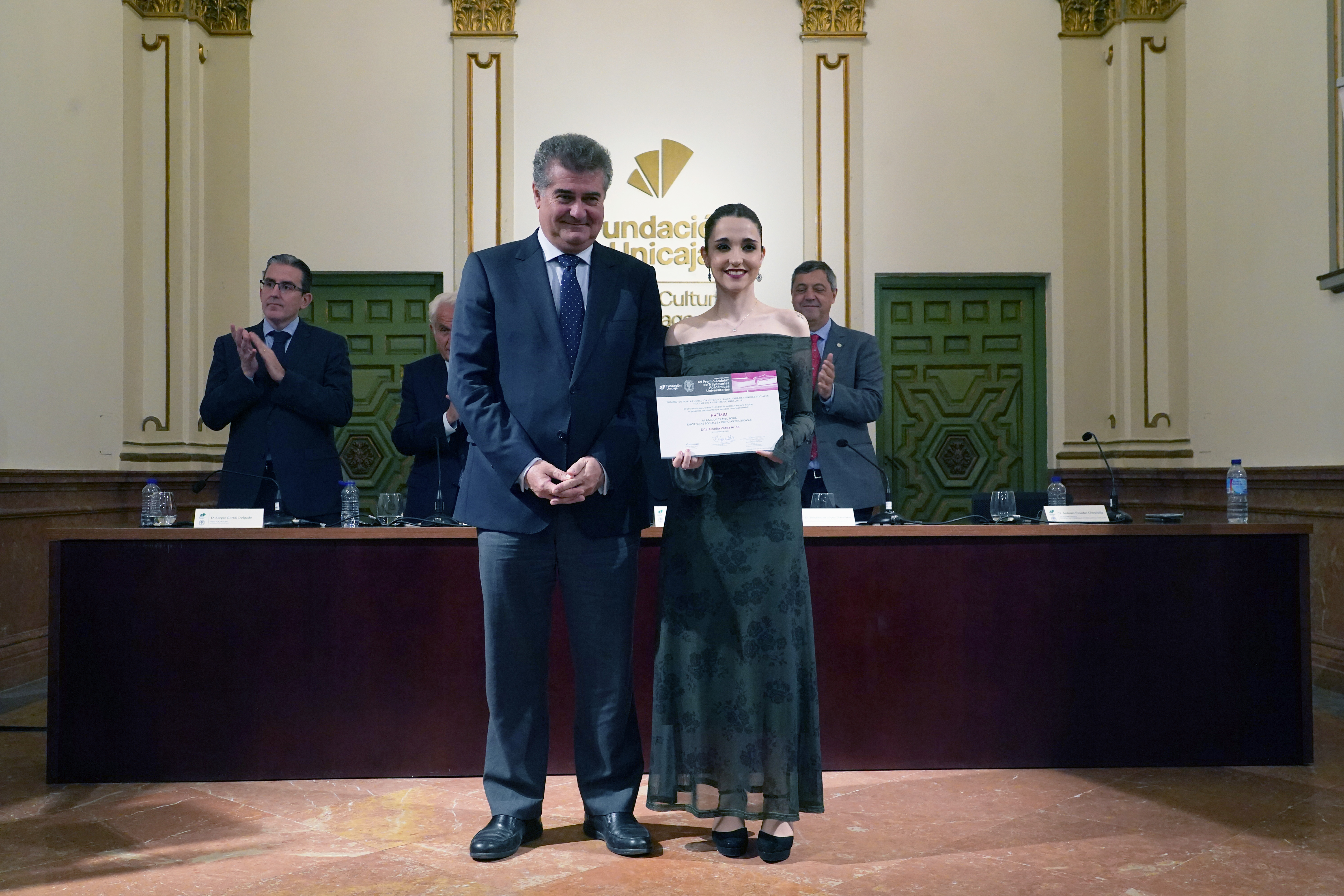 Antonio Posadas Chinchilla entrega el Premio a la mejor trayectoria académica en Ciencias Sociales y Ciencias Políticas a D.ª Noelia Pérez Arias.